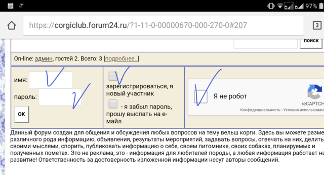 Надо заполнить НИК, ПАРОЛЬ, "зарег.я новый участник" и "я не робот". И нажать "ОК"